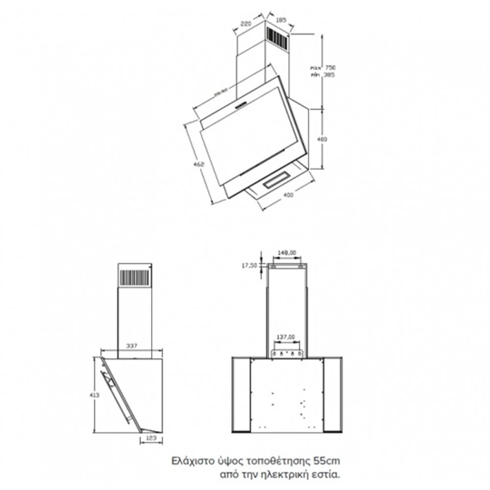 - Ελάχιστο ύψος τοποθέτησης 55cm από την ηλεκτρική εστία